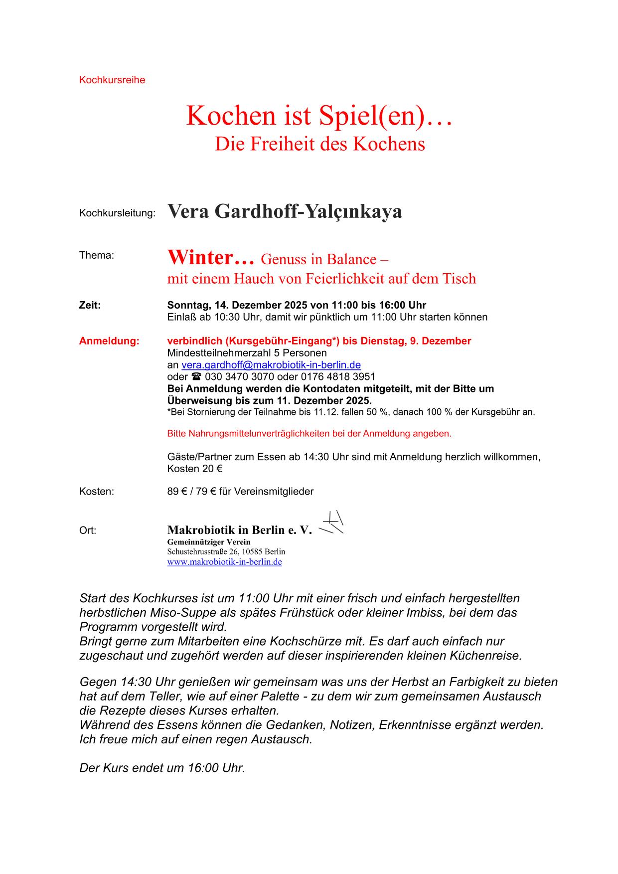 | Kochkurs | So 14.12.2025, 11-16 Uhr | "Winter-Gourmet-Festtags-Kochkurs" mit Vera Gardhoff-Yalçınkaya |